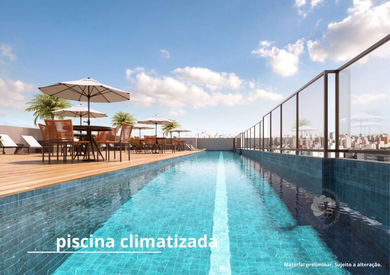 O grande destaque é o lazer no Rooftop, a mais de 85 metros de altura, com uma vista incrível para o skyline da cidade: