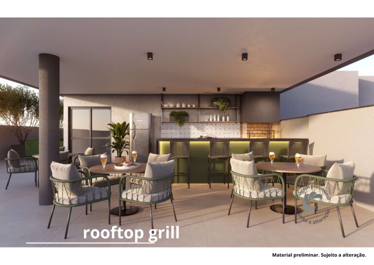 Social e Gourmet: Rooftop Grill, Fire Place, Espaço Gourmet e Salão de Festas com terraço.